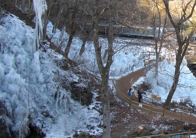 電車が来たので慌てて撮影しました。この付近でも自然の氷瀑や結氷を観ることが出来ます。それと比較すると、水をかけて作った感が強いです。